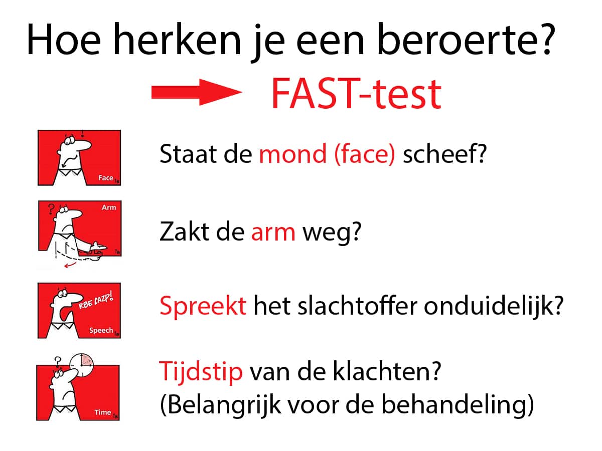 - Verwittig 112 met een duidelijke beschrijving van de toestand van het slachtoffer. Geef daarbij ook altijd door dat het vermoedelijk over een beroerte gaat.